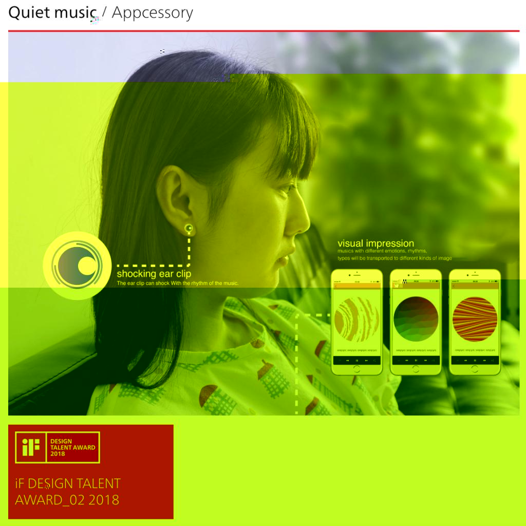2018年iF設計新秀獎共設4個參賽主題。該作品以“智能關懷”(Smart Care)為主題進行設計,其靈感源于對聽障患者的關懷,通過APP将不同類型的音樂提煉為各種色彩組合和動态圖形,同時連接智能設備将音樂節奏轉換為震動的觸感,幫助聽障人群感受音樂的節奏,情感,律動。該作品将在德國漢堡IF設計展中全年展出,并在iF design app刊登無限期展示。